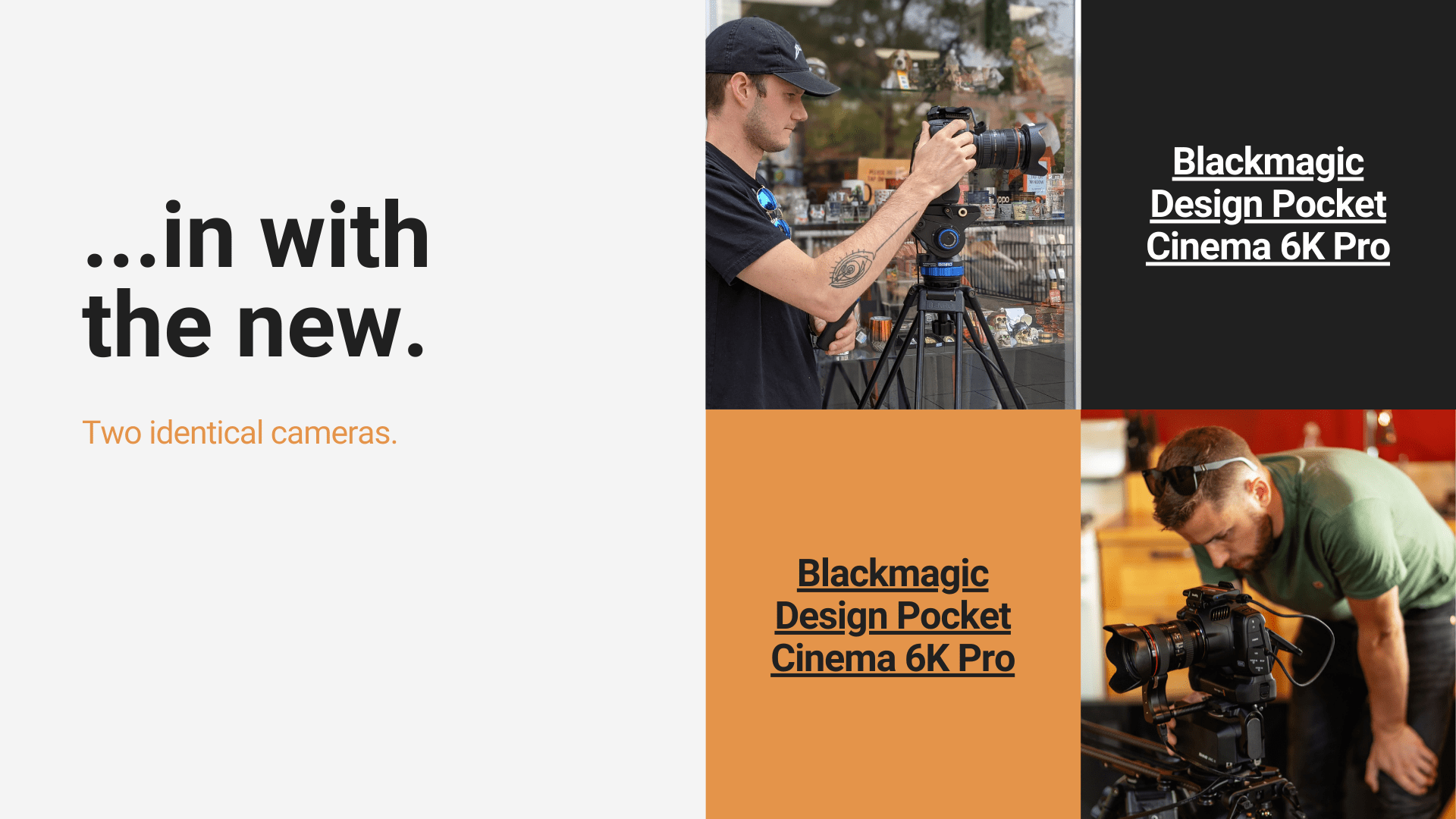 Instead of having two different styles of Sony cameras, I now have two BMPCC 6Ks Pros. Two of the exact same camera. The settings can be dialed in identically. The shots will have the same colour profile. It would cost us time in the past during multi-camera shoots, because every camera is a little different–even if they come from the same brand. Different sensors, different ways of recording video. It’s a challenge to match the footage from the two different cameras. With having two of the same cameras, we can know we’re getting the same type of footage from both cameras.